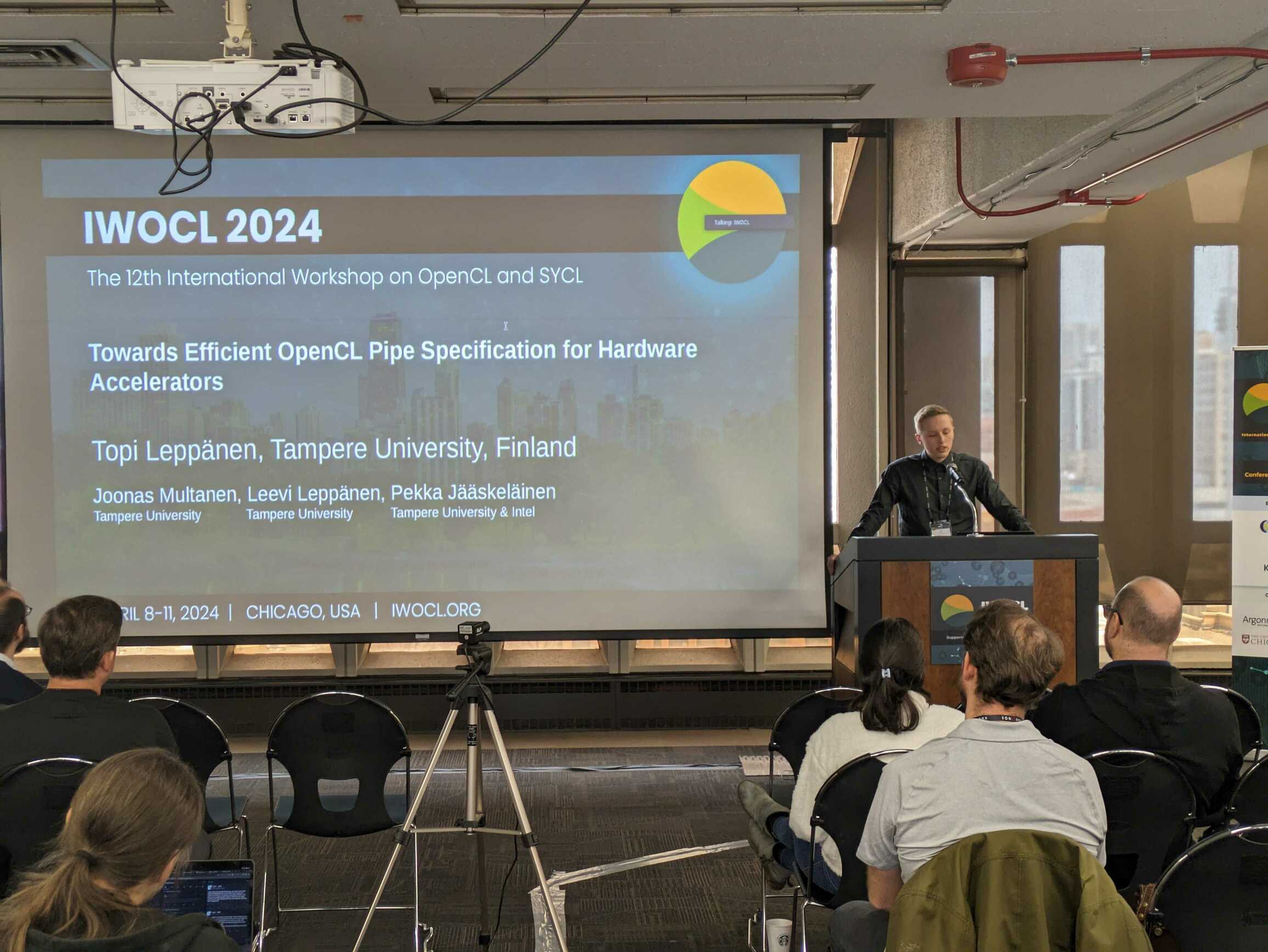 Our doctoral researcher Jan Solanti presented the paper "Latency Reduction Potential of Server-Side Command Buffers in OpenCL-Based Edge Offloading" at IWOCL '25. Command buffers provide applications with a simple way to reduce API overhead from identically repeated workloads, as well as a natural point for OpenCL runtimes to perform optimizations and e.g. submit commands as a batch. We demonstrate this utility of command buffers with a server-side implementation of command buffers in PoCL-Remote, which will be available in the upcoming PoCL 7.0 release.