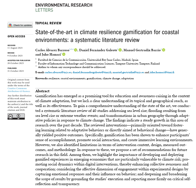 Álvarez Barroso, C., Fernández Galeote, D., Gértrudix Barrio, M & Hamari, J. (2025). State-of- the-Art in Climate Resilience Gamification for Coastal Environments: A Systematic Literature Review. Environmental Research Letters, 20, 113007. https://doi.org/10.1088/1748-9326/ae151d.