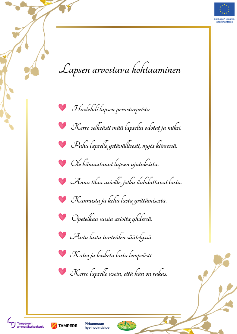 Vanhemmuus ja parisuhde Perhearki Kirjalliset ohjeet Avaa ohje painamalla kansikuvaa, voit avata tulostettavan version klikkaamalla tulostus -symbolia. Vanhemmuus Suomi, English, فارسی (persia), العربي (arabia), Somali Seksuaalisuus synnytyksen jälkeen Suomi, English فارس- (persia), العربي (arabia), Somali Raskauden ehkäisy synnytyksen jälkeen Suomi, English, فارسی (persia), العربي (arabia), Somali Lasten oikeudet Suomessa Suomi, English فارس- (persia), العربي (arabia), Somali Lapsen oikeus turvalliseen kasvuympäristöön Suomi, English, فارسی (persia), العربي (arabia), Somali Myötätuntoinen vanhemmuus Suomi, English, فارسی (persia), العربي (arabia), Somali Vanhemmuus erotilanteessa Suomi, English, فارسی (persia), العربي (arabia), Somali Äidinkieli on tunnekieli Suomi, English, فارسی (persia), العربي (arabia), Somali Lapsen arvostava kohtaaminen Suomi, English, فارسی (persia), العربي (arabia), Somali Videot Vanhemmuuden monet puolet Tekstitykset suomeksi, arabiaksi, persiaksi, englanniksi ja somaliksi Ajatuksia isyydestä - Niitty-hanke Vinkkejä vanhemmuuteen Suomi , English , فارسی (persia) , العربي (arabia) , Somali Raskauden ehkäisy synnytyksen jälkeen